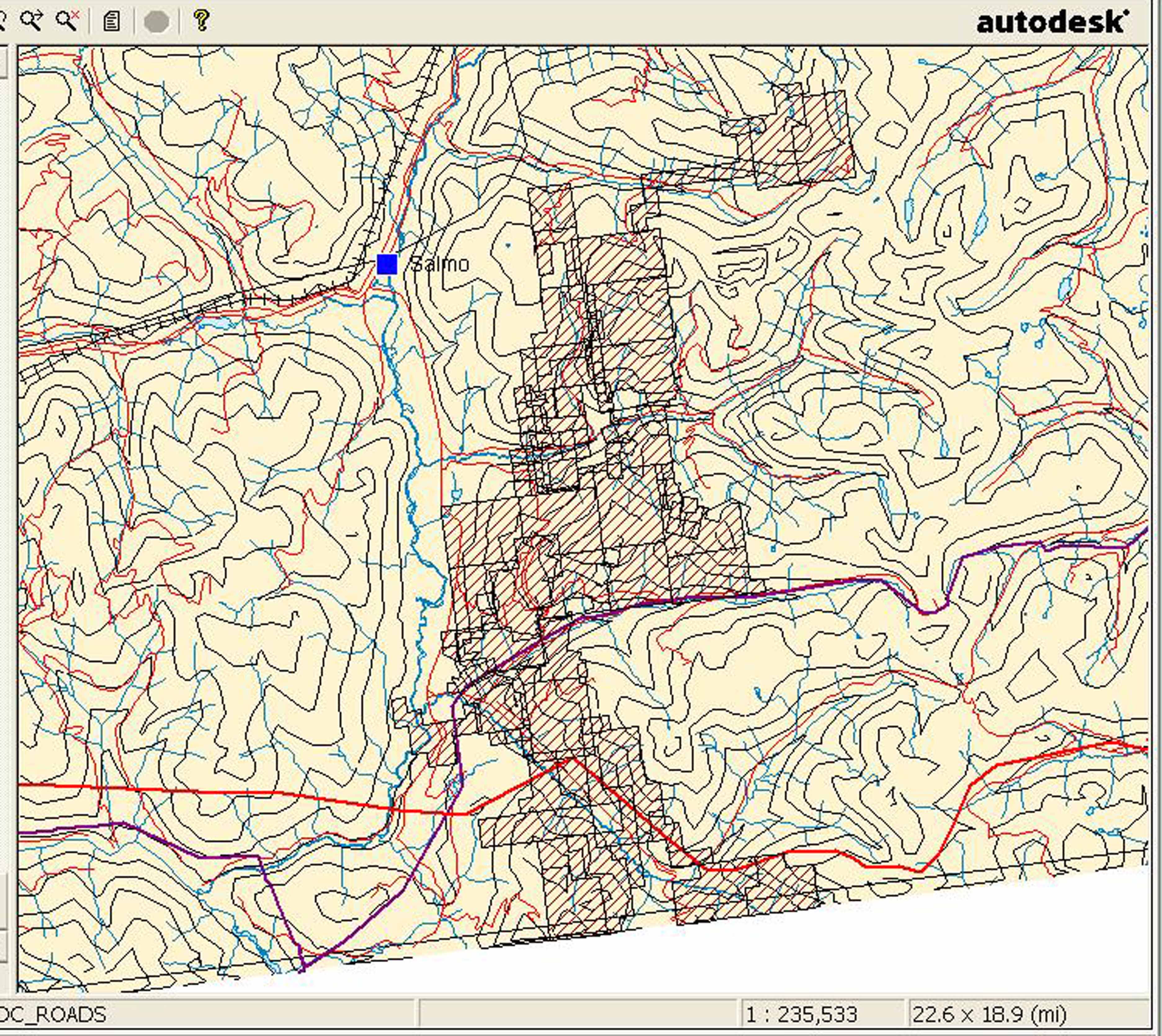 The following map with coutour lines at 200 m elevation intervals shows the relative elevations around Jersey Emerald. Note the 1000 m elevation difference between the Salmo River Valley bottom and the top region of Iron Mountain. Note also that the top ridge of Iron Mountain extends eastward about 7 km and then dips slightly before rising further up Nevada mountain.