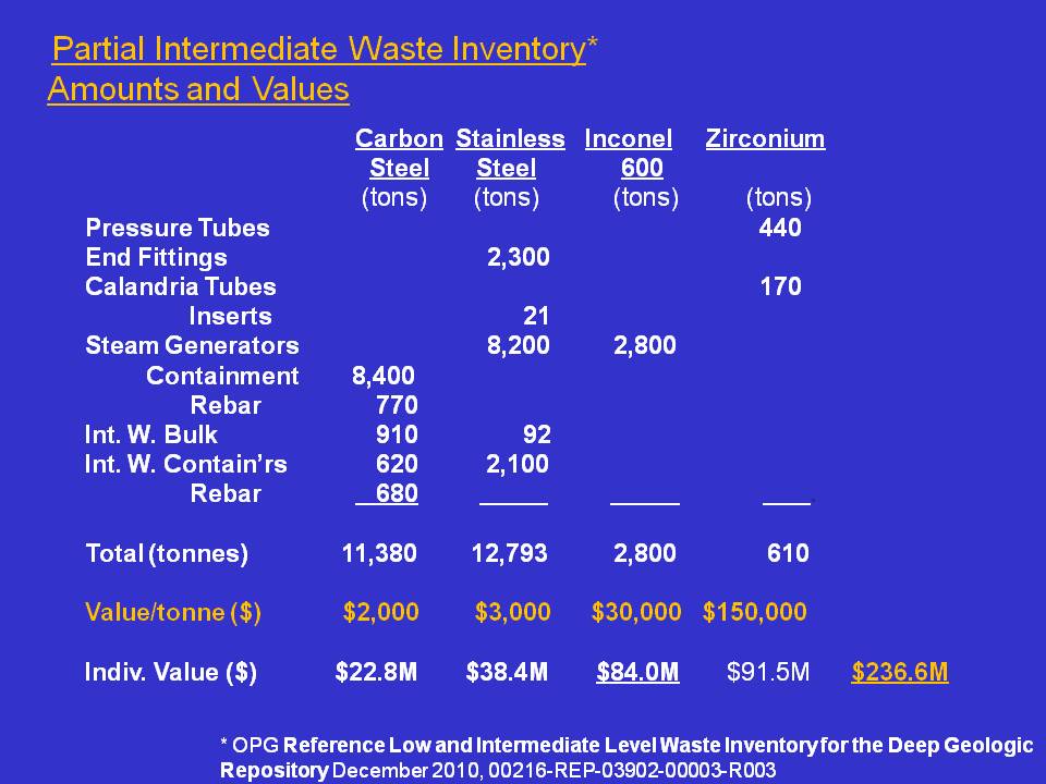One of the benefits of accessible dry storage is that the radioactive materials can be reused at considerable cost saving. As shown on the following table Peter Ottensmeyer has calculated that reuse of the current inventory of low and intermediate nuclear waste could yield material cost savings of about $236.6 million.