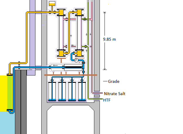 4) The NaK dumps its heat into NaK-salt and NaK-HTF heat exchangers.  During a reactor cold shutdown the salt is used to remove heat until the salt approaches its freezing point at which time the NaK-HTF heat exchangers continue to remove  heat provided that HTF circulation continues and the pressure setting in the steam generators is reduced.