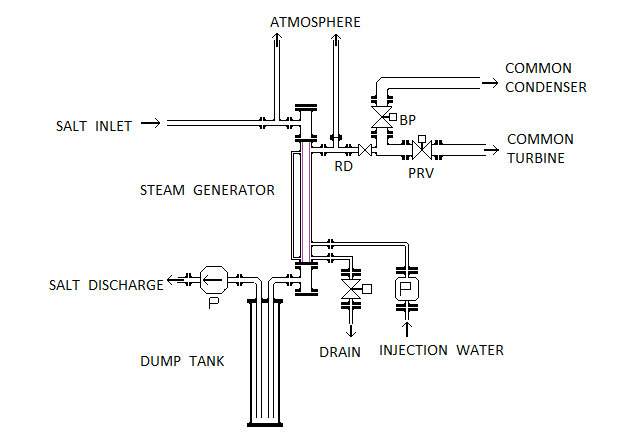 The NaK is hottest in the top manifold of the steam generator and flows almost straight downwards inside the tubes. The water is coolest at the bottom of the steam generator shell space above the lower manifold and flows upwards in a zig zag pattern set by internal flow baffles. The high thermal conductivity of the NaK minimizes heat transfer limitations due to laminar NaK flow in the steam generator tubes.