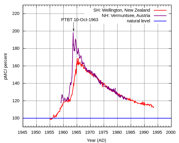 Nuclear bomb tests yielded the following graphs of atmospheric C-14 concentration as a function of time. Note that there is a time delay of about a year between the C-14 rise time in the northern hemisphere and the corresponding rise time in the southern hemisphere. Hence data taken during the first few years after the explosions is invalid due to C-14 still being in the process of spreading evenly around the world.