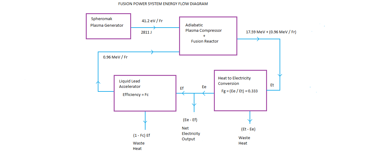 The plasma compressor uses spherically convergent liquid lead with an initial radial velocity of - 300 m / s to adiabatically compress the plasma to a temperature of 120 keV / plasma particle at Ri = Rih. The fraction of the plasma particles that react is Fr. Thus for a 17.591 MeV per particle group fusion energy output the required input energy is: