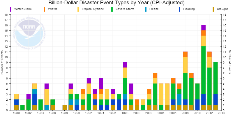 A global warming increases the frequency and size of local hot spot atmospheric emission temperature transitions above 273.15 K (0.00 degrees C). which increases the frequency and violence of major storms. Shown below is a graph prepared by NOAA showing the gradual increase in annual violent storm damage.