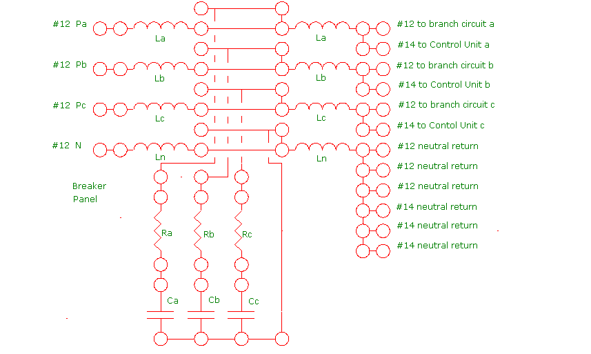 Hence, for a load consisting of 3 two lamp ballasts the Premium Circuit Filter reduces the noise voltage coupled from the circuit breaker panel electrical bus to the branch lighting circuit by a factor of .01256. For design purposes it is convenient to impose the requirement that there are always at least three two lamp ballasts connected to a branch lighting circuit.
