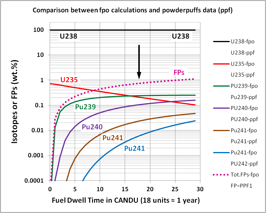Peter Ottensmeyer has provided the following graph showing U-235 depletion, Fission Product (FP) formation and TRU production in CANDU reactor fuel as a function of fuel dwell time in the reactor. Note that after 1.5 years (18 months), which is the working life of CANDU fuel, the TRU concentration plateaus at about 0.4%.